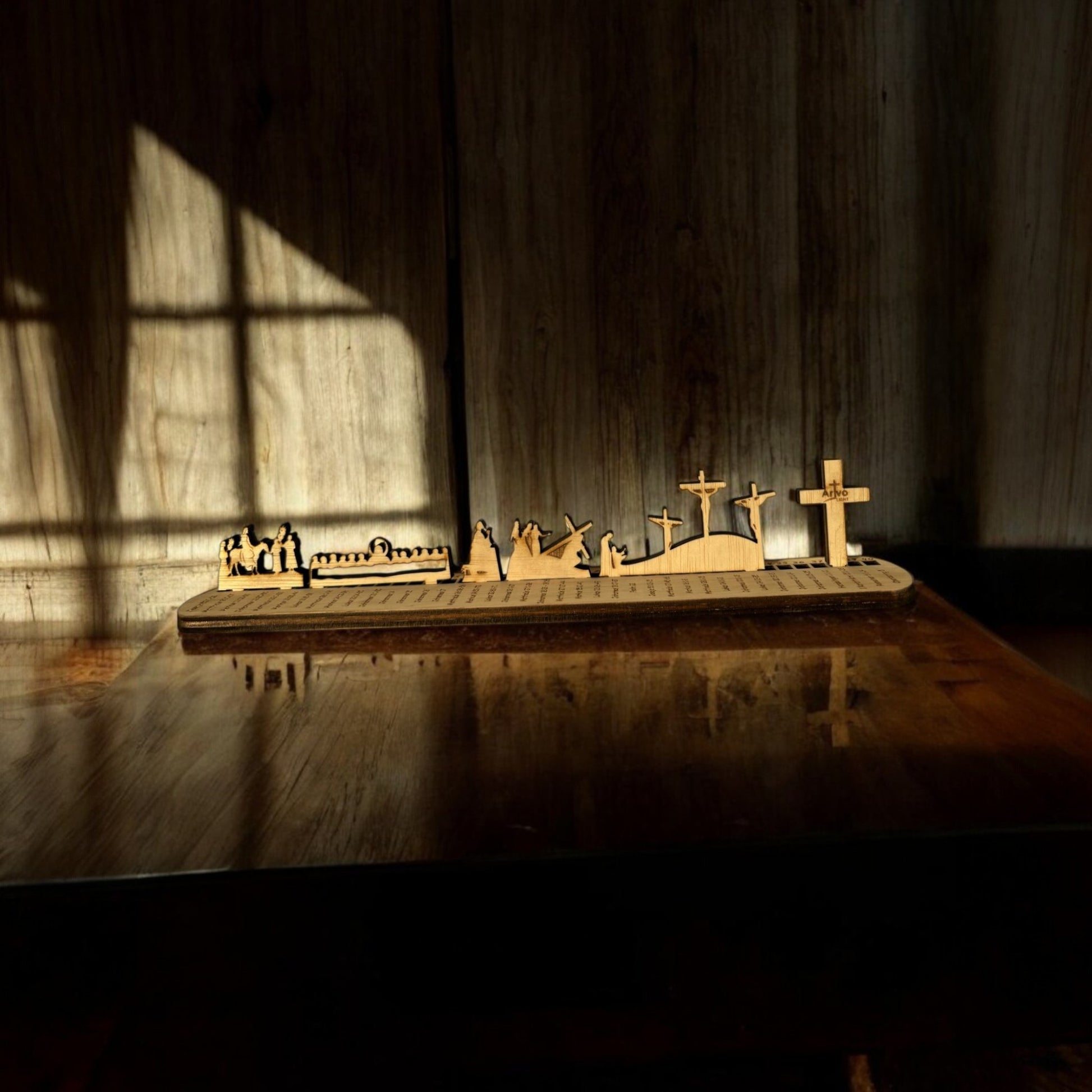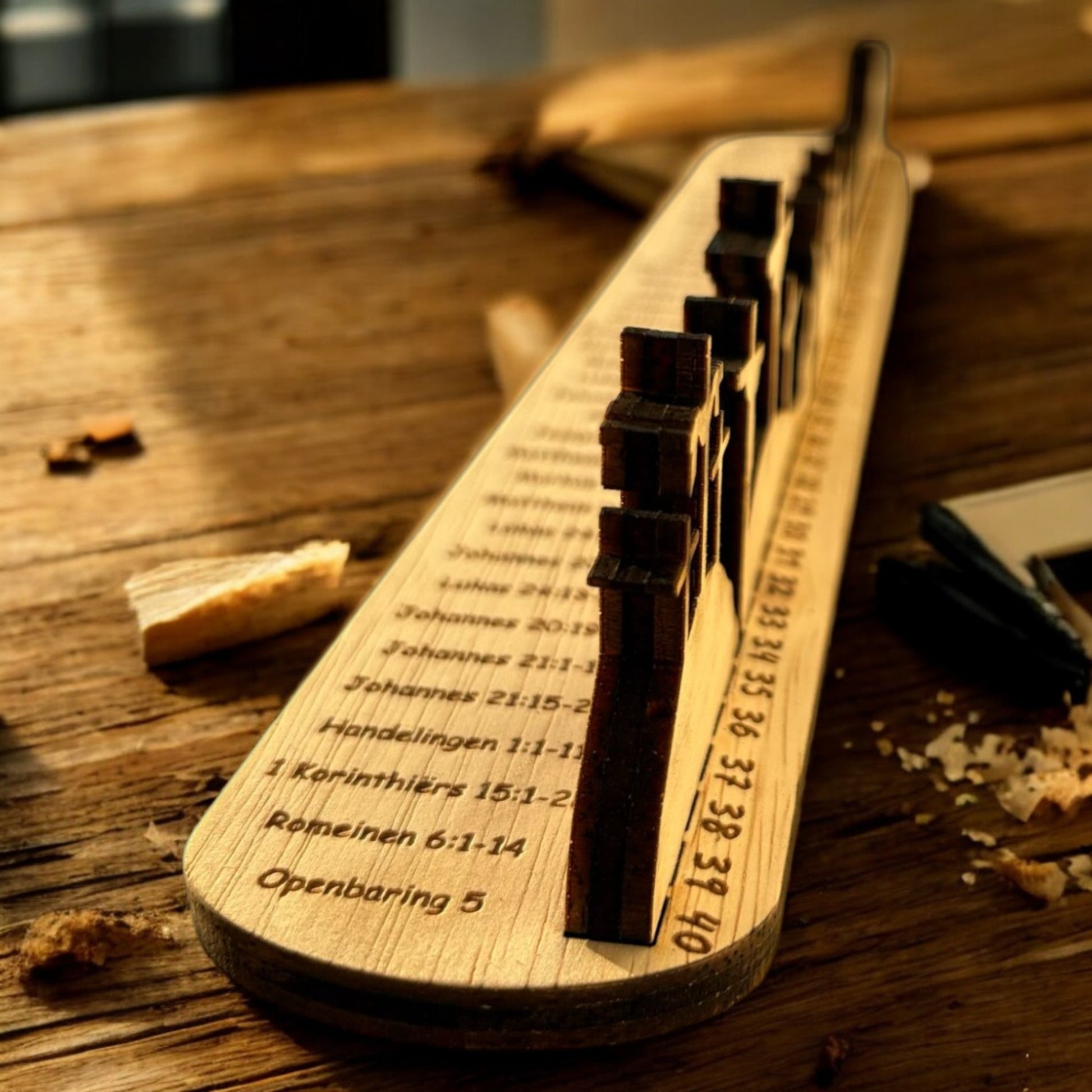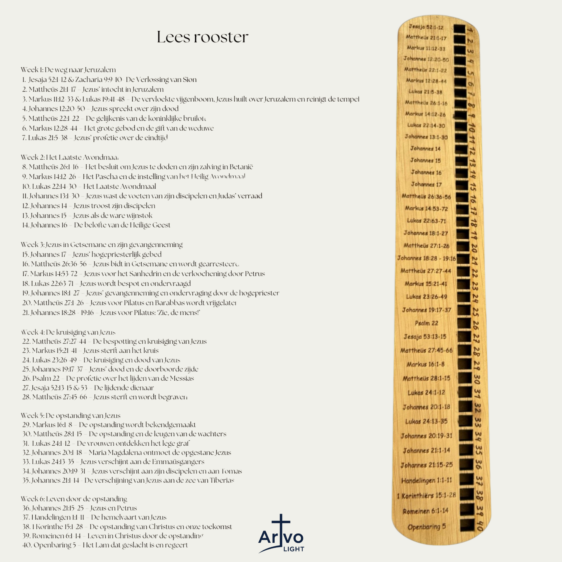 We hebben een volledig nieuw leesplan samengesteld, speciaal ontworpen om je te helpen gedurende 40 dagen bewust met de Bijbel en de vastentijd bezig te zijn. Elke dag lees je een bijbelgedeelte en schuif je het houten kruisje een stukje verder op het plankje. Ondertussen vorm je met de houten illustraties een compleet tafereel dat de belangrijkste momenten van het paasverhaal uitbeeldt.
