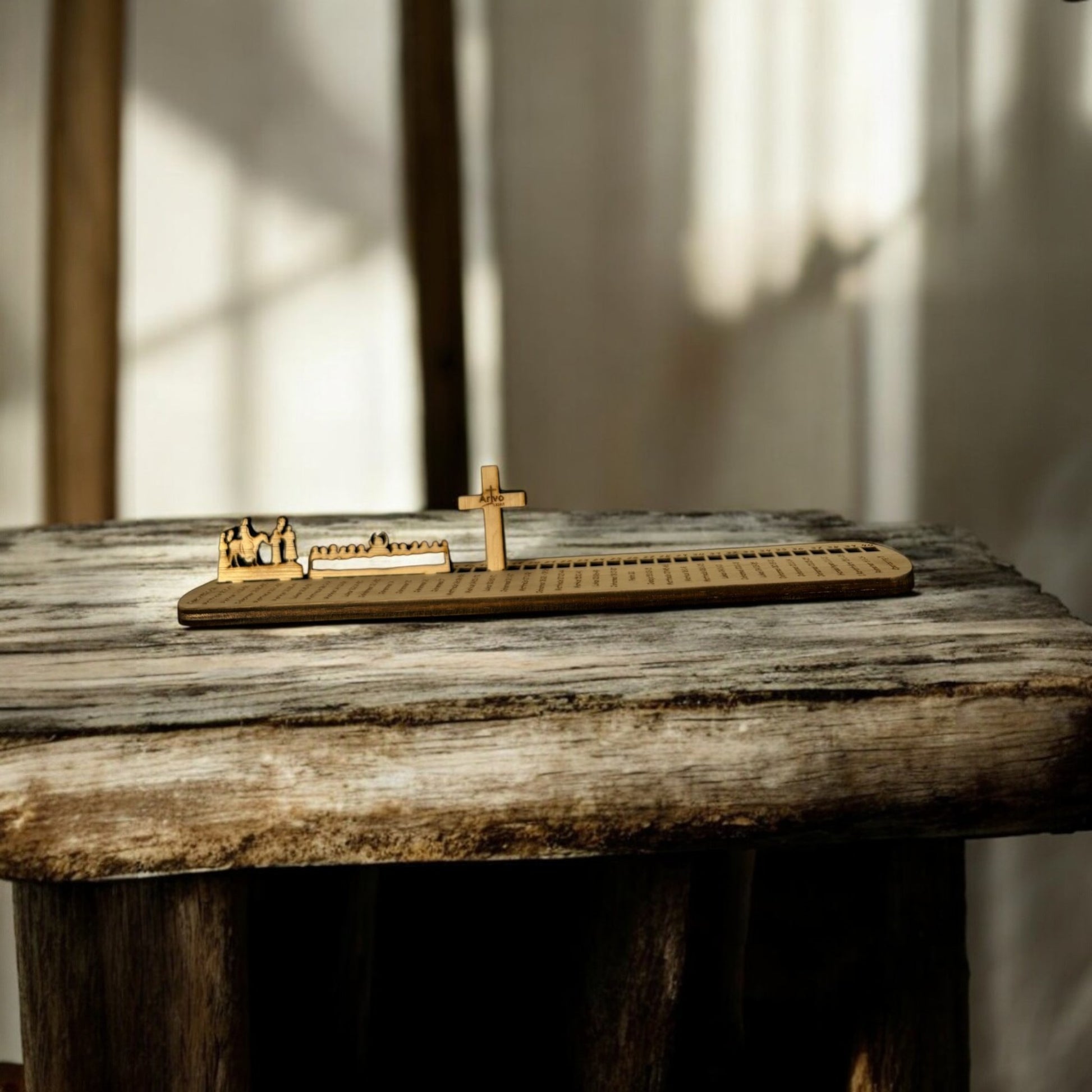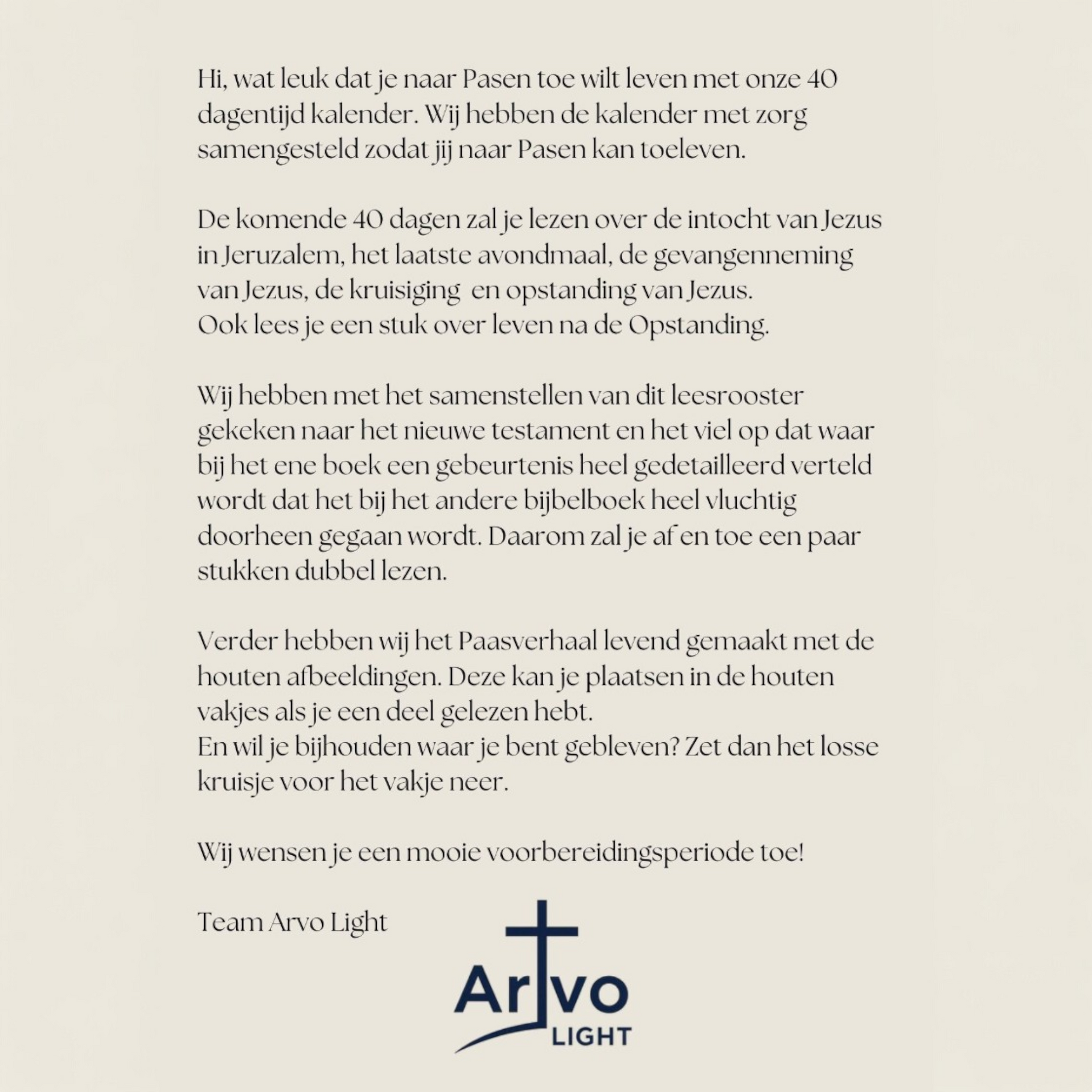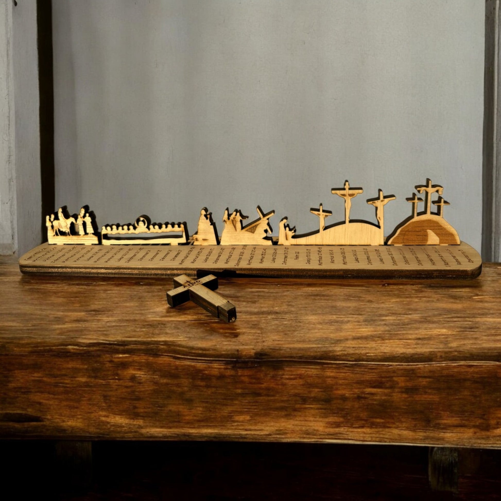 We hebben een volledig nieuw leesplan samengesteld, speciaal ontworpen om je te helpen gedurende 40 dagen bewust met de Bijbel en de vastentijd bezig te zijn. Elke dag lees je een bijbelgedeelte en schuif je het houten kruisje een stukje verder op het plankje. Ondertussen vorm je met de houten illustraties een compleet tafereel dat de belangrijkste momenten van het paasverhaal uitbeeldt.