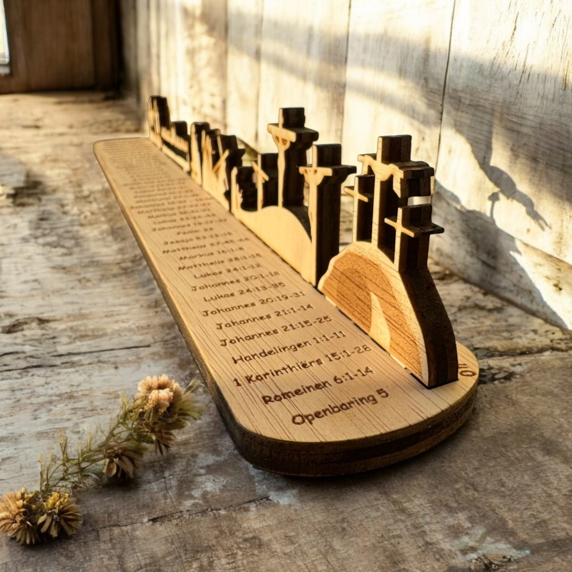 Beleef de 40-dagentijd op een interactieve en visuele manier met deze unieke aftelkalender. Dit stijlvolle houten plankje van ca. 35 cm neemt je stap voor stap mee door het paasverhaal.